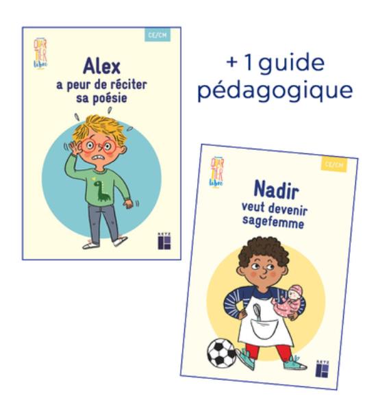 In deze kennismakingsset van Quartier libre vindt u 1 exemplaar van de roman Alex a peur de réciter sa poésie en 1 exemplaar van Nadir veut devenir sagefemme (beide 32 pagina's, formaat 13 x 19 cm), evenals een gemeenschappelijke pedagogische gids van 32 pagina's.