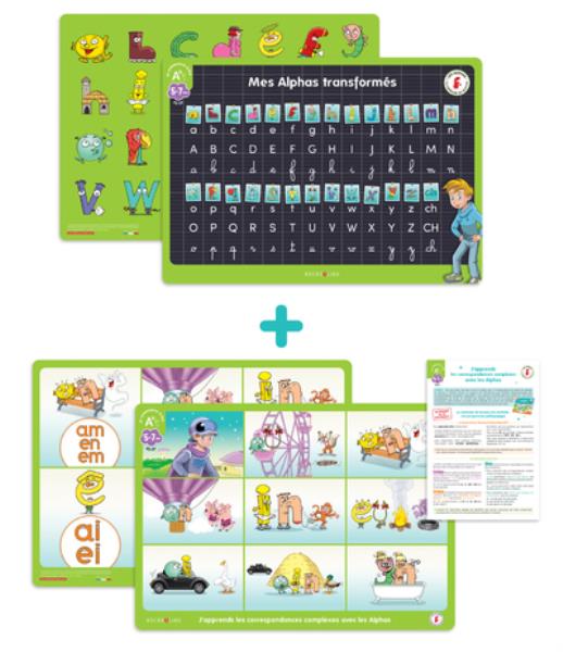 Ce lot de deux sous-mains A3 (29,7 x 42 cm) réunit Mon sous-main des Alphas transformés et Mon sous-main Alphas des correspondances complexes. Le premier présente, au recto, les différents types d'écriture et les Alphas associés afin d'aider l'enfant à faire le lien entre les personnages et les lettres ; au verso, les Alphas seuls servent de rappel.