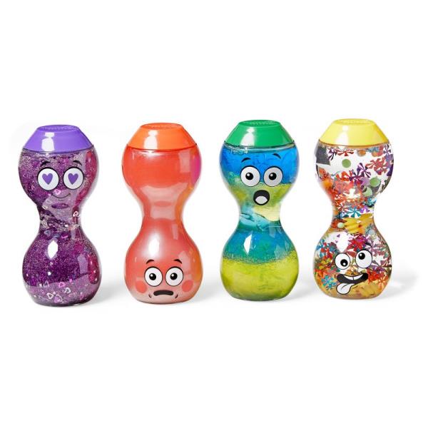 Chaque bouteille représente une émotion distincte – Embarrassé, Idiot, Surpris et Aimé – avec une couleur, une expression faciale et un élément interactif spécifique. En les secouant et en les faisant tourbillonner, les enfants développent leurs compétences sociales et émotionnelles tout en s’amusant.