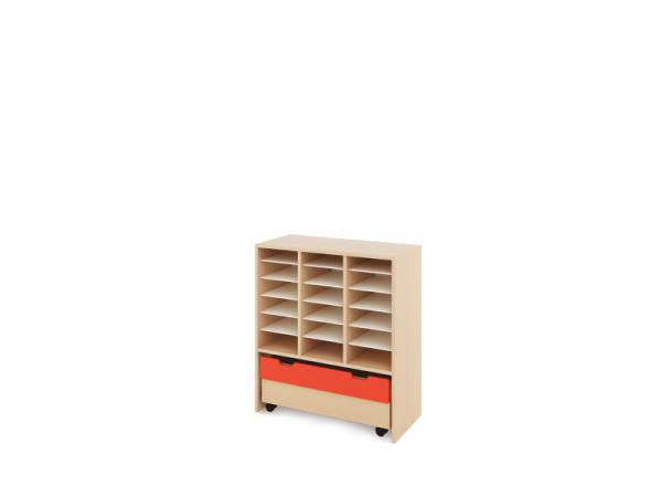 Le meuble est équipé de 15 étagères en HDF blanc de 25,2 x 33,9 cm et 3 mm d’épaisseur, ainsi que d’un bac en panneau d’aggloméré de 76,6 x 35,6 x 31 cm. La surface est lisse et la façade est en rouge.