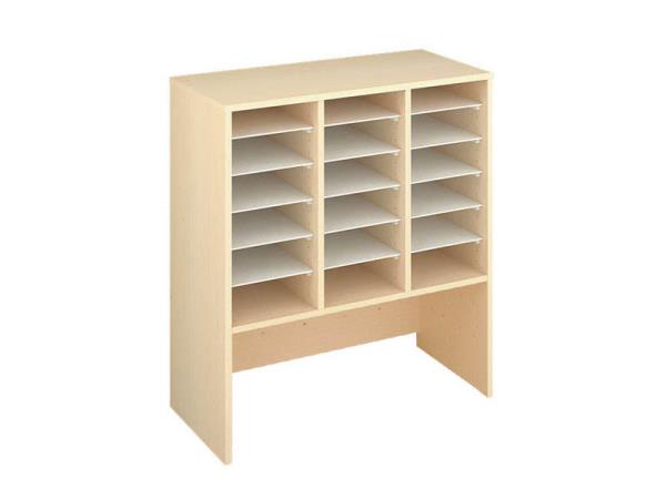 Meuble de rangement L avec compartiments pour bac, en finition hêtre.