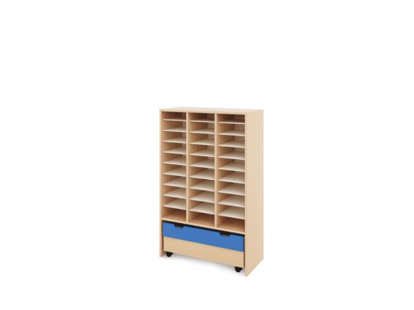 Le meuble offre 27 niches et est équipé de 21 étagères en HDF blanc, dimensions 25,2 x 33,9 cm, épaisseur 3 mm.