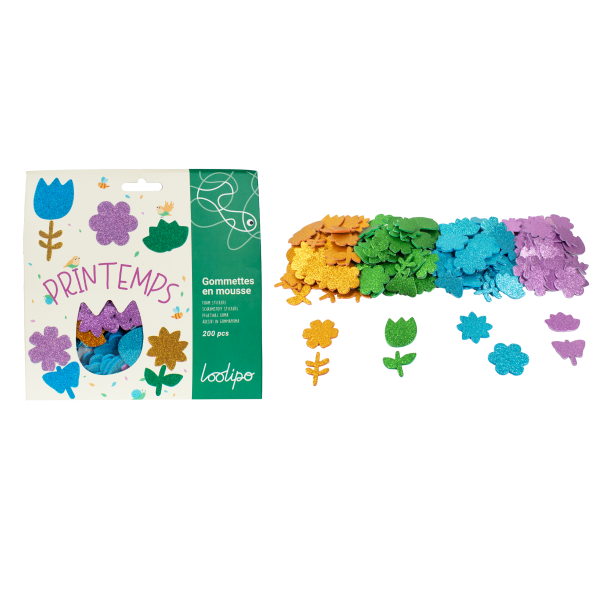 Ce pack comprend 200 gommettes brillantes en mousse EVA (épaisseur 2 mm), parfaites pour les activités manuelles et décorations printanières.