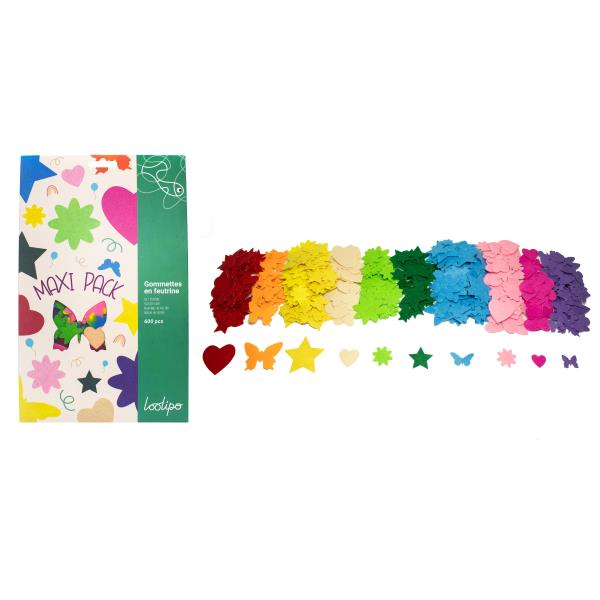 Ce maxi pack réunit 4 assortiments de 150 pièces chacun, soit 600 formes en feutrine adhésive 1 mm, sur le thème du printemps : fleurs, papillons, cœurs et étoiles.