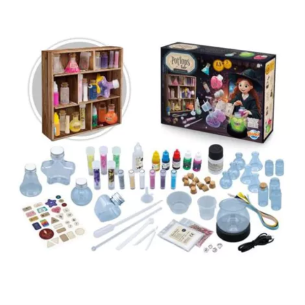 Grâce à la base lumineuse, tes potions deviennent de superbes veilleuses enchantées. Et pratique : une partie de la boîte se transforme en étagère pour exposer tes flacons ! Dans le chaudron, découvre aussi 5 expériences magiques à réaliser avec les réactifs fournis et des ingrédients de la maison.
