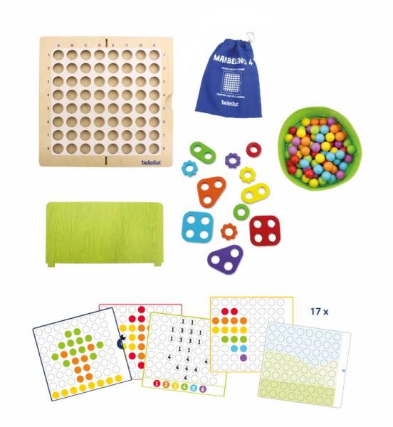 À vos boules, prêts, partez ! Marbelino 4 Creating est un jeu de tri et de construction avec boules colorées et formes en bois, invitant les enfants à reproduire des motifs, créer des images originales et même explorer la construction en 3D.